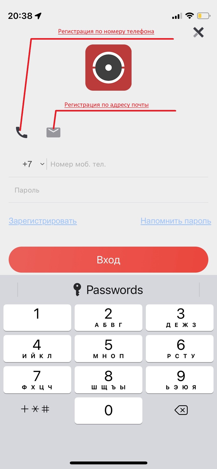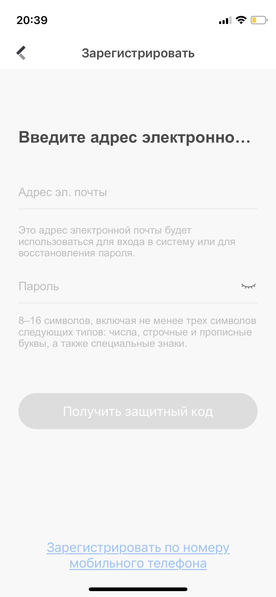 Скачайте и установите приложение на свое устройство. Зарегестрируйте аккаунт следуя подсказкам в приложении. Регистрация проходит по номеру телефона или адресу электронной почты. После ввода номера телефона или почты, необходимо придумать пароль, который должен состоять минимум из одной заглавной и одной прописной латинской буквы и цифр, минимальное количество символов 8. Например: Aa123456