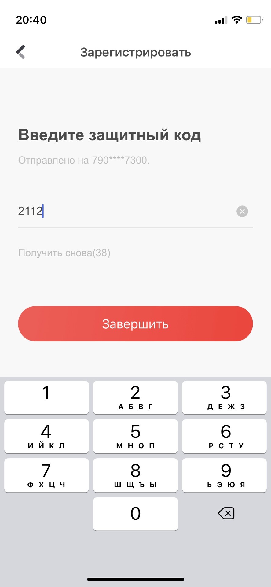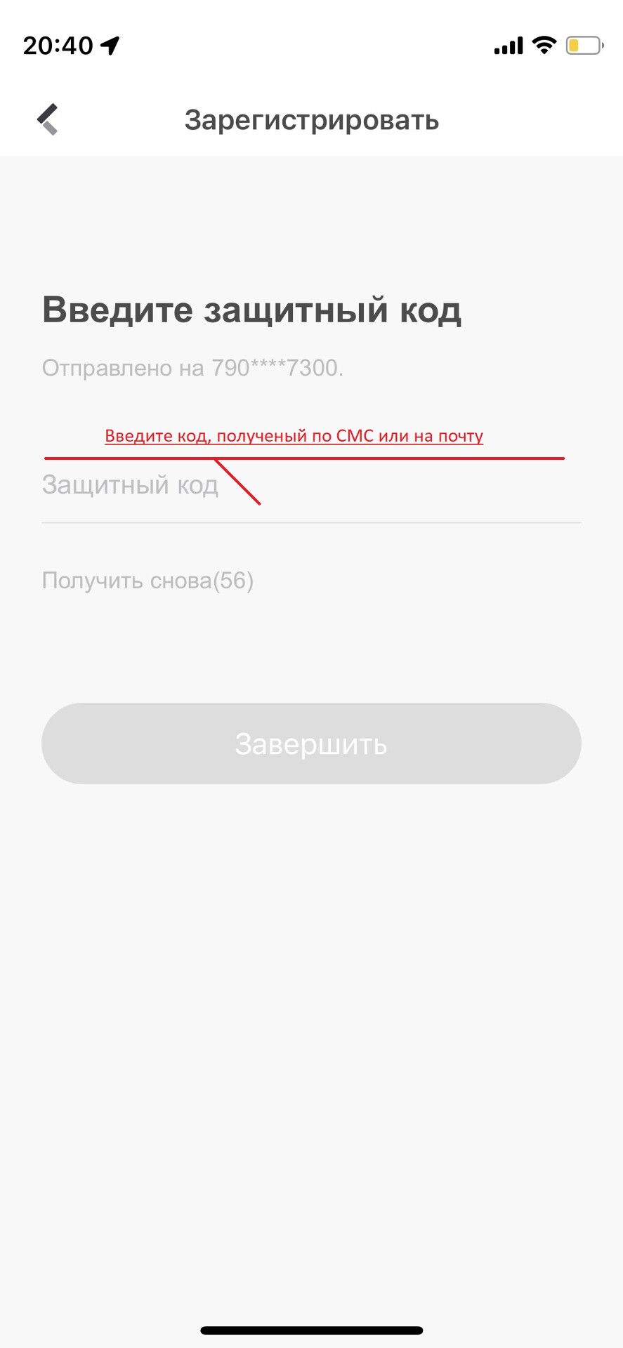 Далее по выбранному способу регистрации аккаунта (по телефону или почте) на ваш номер телефона или на адрес электронной почты придет код подтверждения. Скопируйте код в соответствующее поле в приложении и нажмите кнопку Завершить.