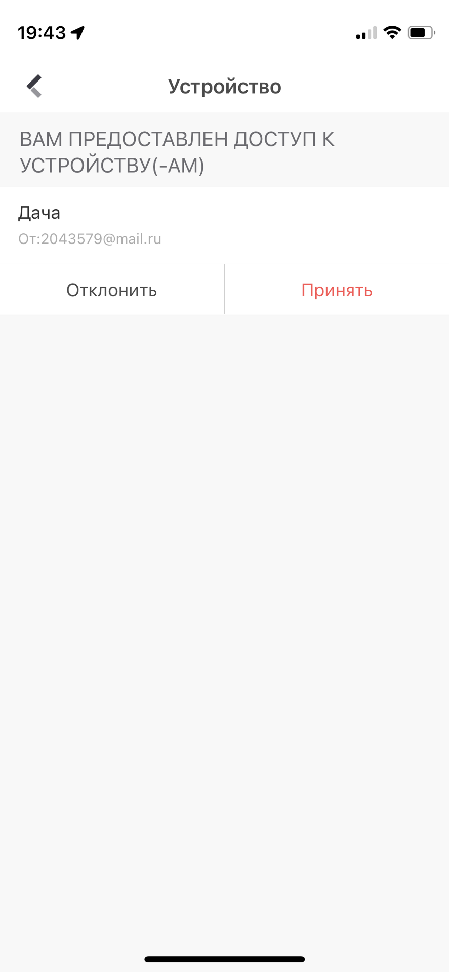 Для получения доступа к устройству вам необходимо передать свой номер телефона или адрес элекстронной почты (в зависимости от способа регистрации) администратору устройства. После этого ожидайте уведомление о предоставлении доступа к устройству. Как только вы подтвердите доступ, нажав кнопку Принять, на основной странице приложения появится устройство.