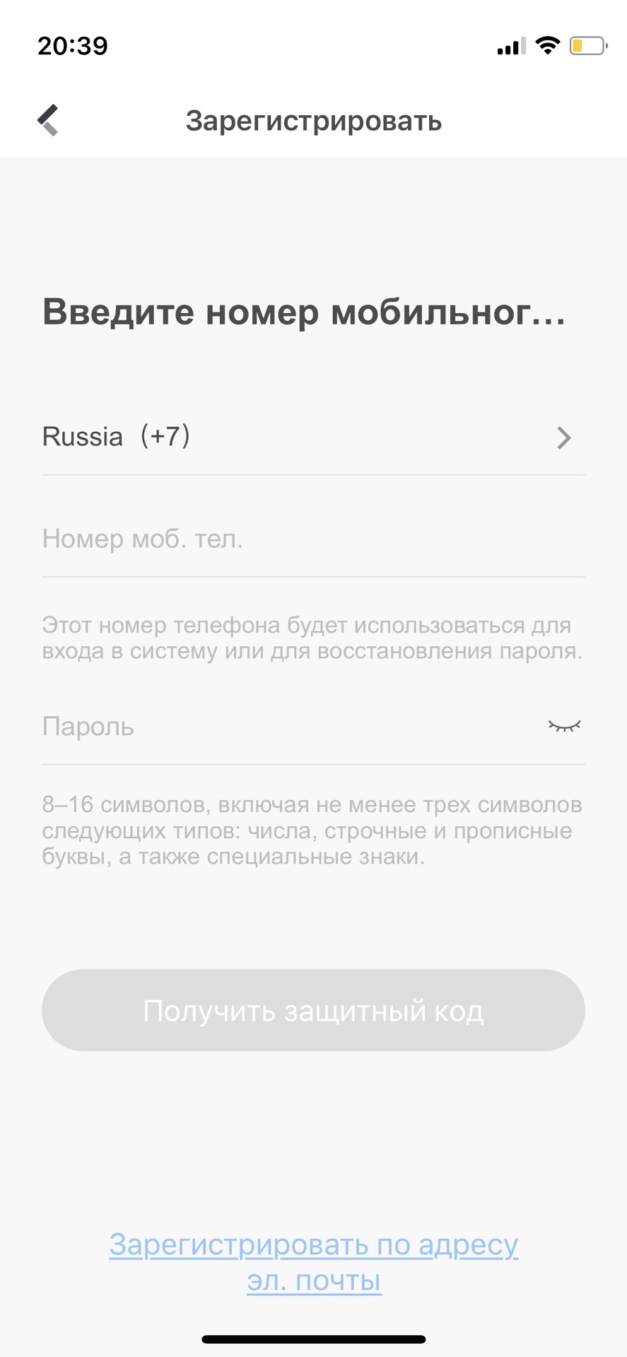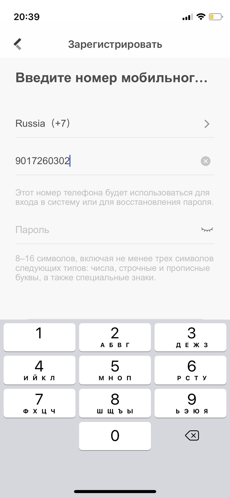 Скачайте и установите приложение на свое устройство. Зарегестрируйте аккаунт следуя подсказкам в приложении. Регистрация проходит по номеру телефона или адресу электронной почты. После ввода номера телефона или почты, необходимо придумать пароль, который должен состоять минимум из одной заглавной и одной прописной латинской буквы и цифр, минимальное количество символов 8. Например: Aa123456